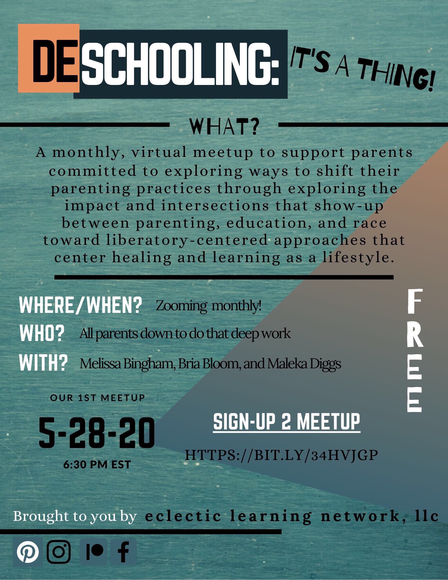 I am so excited to announce a collaboration between Eclectic Learning Network, Melissa Bingham, and myself. A monthly, cost-free, meet-up for parents and caregivers — Deschooling: It’s A Thing! Together we will explore and work through the life-long process of Deschooling in all of its many forms and particularly as it relates to our relationships, especially with young people. See more details, and sign-up, on Eclectic Learning Network’s website.